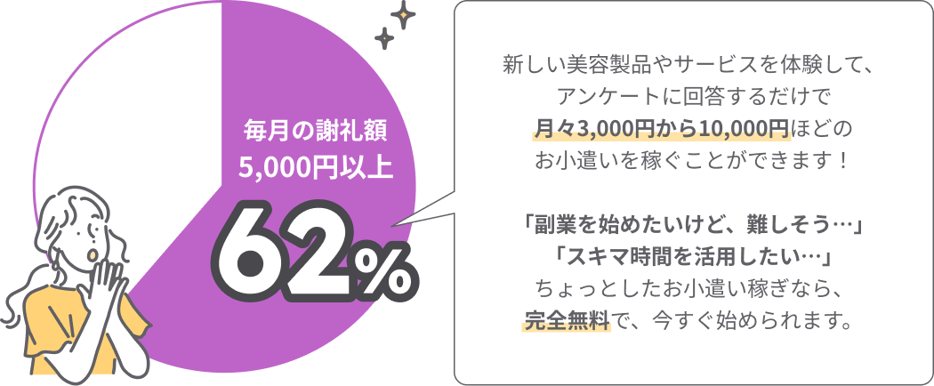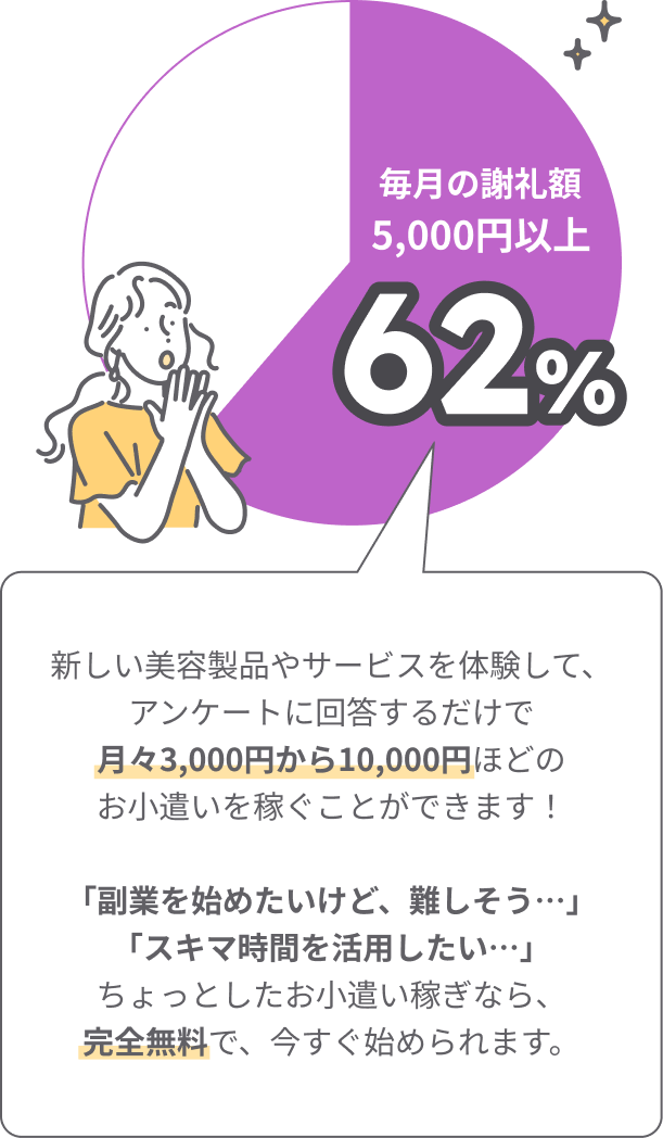 お仕事の実施数によって異なりますが、月1万円~10万円程度稼ぐ方も多くいらっしゃいます。複数のお仕事を組み合わせることで、さらに増やすことも可能です。
